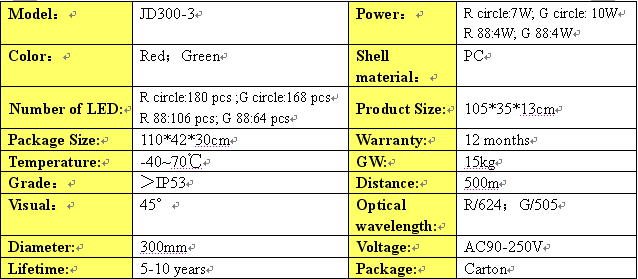 JD300-3-RG three units with full screen countdown combination of LED traffic lights,ultra-high brightness light-emitting diode chips AlInGaP and InGaN as a product of light, low power consumption, long life, maintaining a reasonable cost of the product.