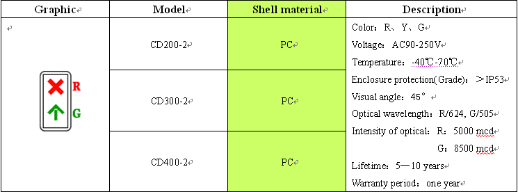 CD200-2 LED Lane traffic lights, generally used in toll stations, tunnels, ports, parking lot and other traffic road lights, With high efficiency, long life; high temperature resistant, resistance to vibration, low power consumption, moisture, dust Etc. features.