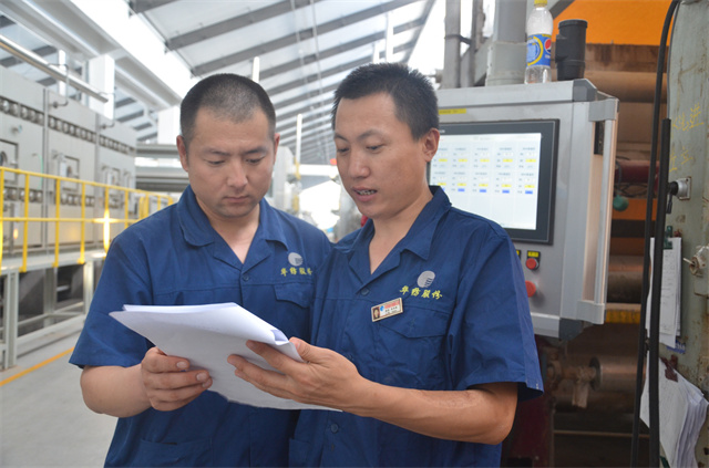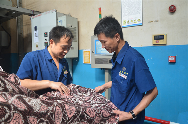 花布車間現場主管紀方超(右)與焙烘機機長孫海雷,在查看金粉印花生產質量。