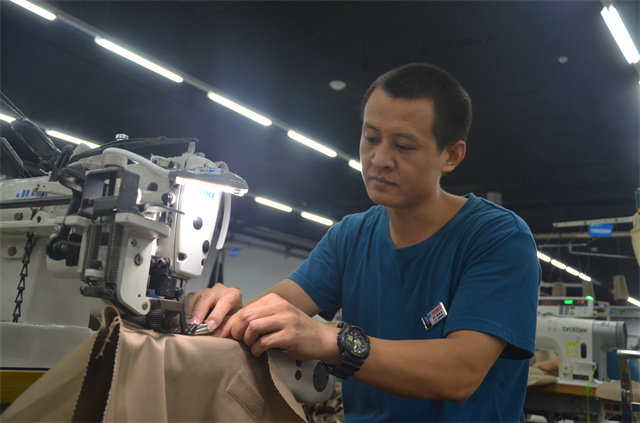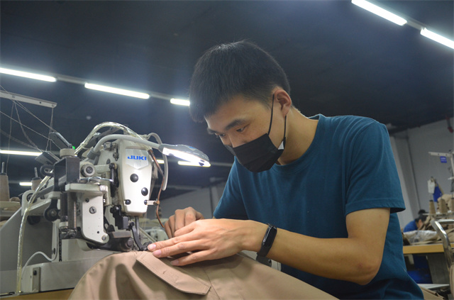 服裝車間縫制二班多能工郭叢叢進入公司10年來,靠著不斷追求精進,成長為對服裝生產各環節駕輕就熟的“老把式”。
