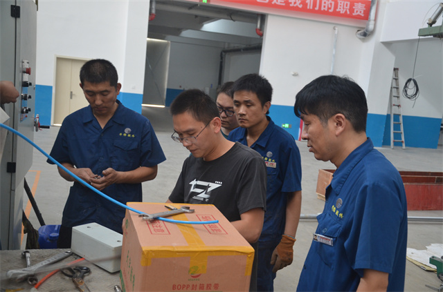 家紡車間卞兆穩(右一)等人,正在為印花機安裝新配件。