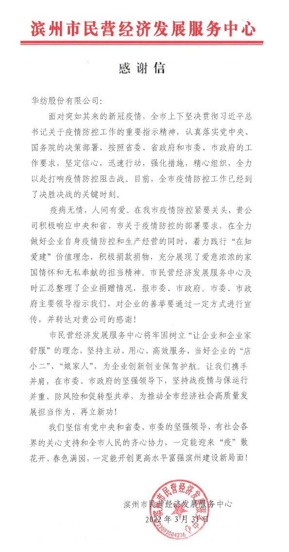“疫病無情,人間有愛。在我市疫情防控緊要關(guān)頭,貴公司積極響應(yīng)中央和省、市關(guān)于疫情防控的部署要求,在全力做好企業(yè)自身疫情防控和生產(chǎn)經(jīng)營(yíng)的同時(shí),著力踐行‘在知愛建’價(jià)值理念,積極捐款捐物,充分展現(xiàn)了愛意濃濃的家國(guó)情懷和無私奉獻(xiàn)的擔(dān)當(dāng)精神……”這是3月31日濱州市民營(yíng)經(jīng)濟(jì)發(fā)展服務(wù)中心發(fā)給公司感謝信中的一段話。