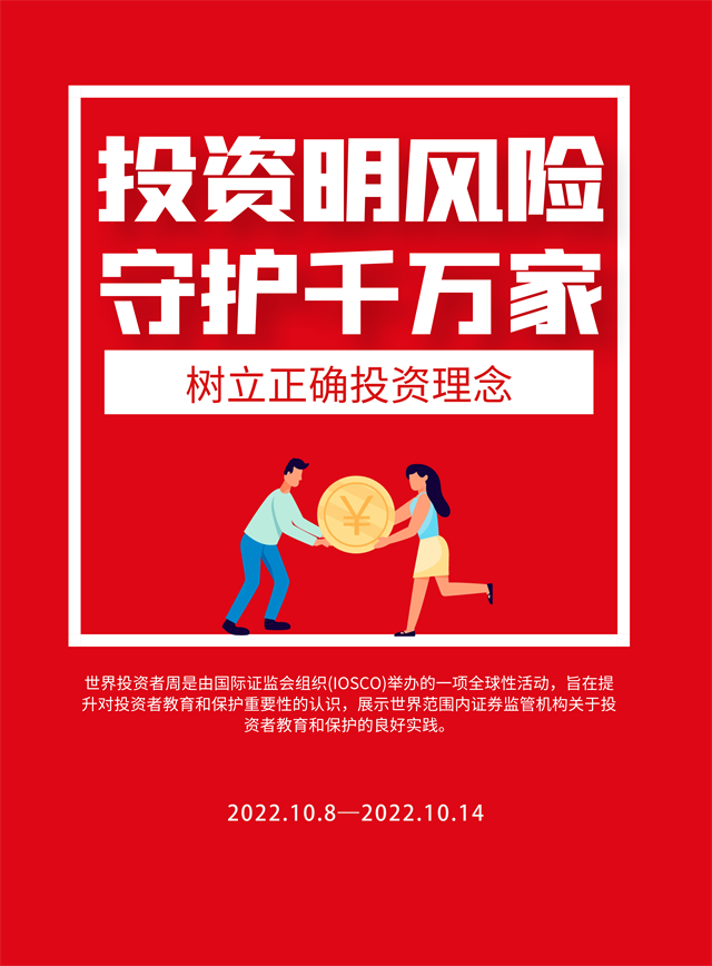 2022年“世界投資者周”將圍繞“投資明風險,守護千萬家”主題,向投資者普及《期貨和衍生品法》、普及綠色金融、綠色投資理念,引導投資者閱讀上市公司定期報告、踐行以信息披露為核心的注冊制理念,向投資者傳播金融證券知識,提示投資風險,增強理性投資、價值投資、長期投資、風險防范意識,引導投資者樹立正確投資理念。