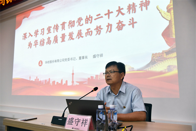 盛守祥指出,黨的二十大是在全黨全國各族人民邁上全面建設社會主義現代化國家新征程、向第二個百年奮斗目標進軍的關鍵時刻召開的一次十分重要的大會,是一次高舉旗幟、凝聚力量、團結奮進的大會。大會回顧總結了過去五年的工作和新時代十年的偉大變革,闡述了開辟馬克思主義中國化時代化新境界、中國式現代化的中國特色和本質要求等重大問題,對全面建設社會主義現代化國家、全面推進中華民族偉大復興進行了戰略部署。也為我們華紡事業高質量發展指明了前進方向。華紡作為中國紡織印染行業重要骨干力量,將堅決貫徹黨的二十大精神,牢牢把握新時代新征程黨的使命任務,自覺把責任擔當放在心上、扛在肩上,以高質量發展為目標,踔厲奮發推進高水平現代化企業建設。