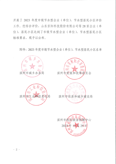 近日,濱州市城鄉水務局、濱州市發展和改革委員會、濱州市工業和信息化局、濱州市住房和城鄉建設局、濱州市機關政務保障中心發布了《關于公布2023年度市級節水型企業(單位)、節水型居民小區評價結果的通知》,經綜合評價,公司達到市級節水型企業(單位 )、節水型居民小區標準要求,獲評2023年度濱州市節水型企業。