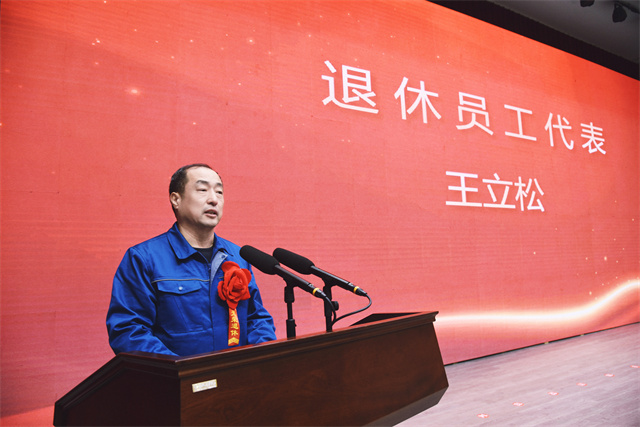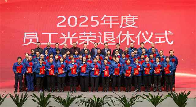 會議為2025年度退休員工舉行光榮退休儀式。公司黨委委員、紀委副書記、副總經理孫玉濤宣讀退休員工名單,黨委書記、董事長盛守祥為退休員工代表頒發榮譽證書。退休員工代表王立松作為退休職工代表發言,深情訴說數十載與公司同行的點滴,誠摯送上對公司的衷心祝福。