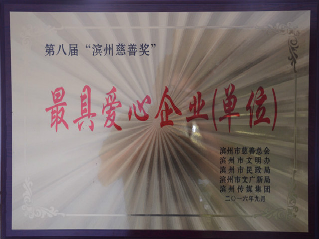 近日,由濱州市慈善總會、市精神文明建設委員會辦公室、市民政局、市文化廣電新聞出版局、濱州傳媒集團等聯合舉辦的第八屆“濱州慈善獎”評選表彰活動圓滿結束,公司以對慈善事業的突出貢獻,榮獲“最具愛心企業(單位)”稱號。