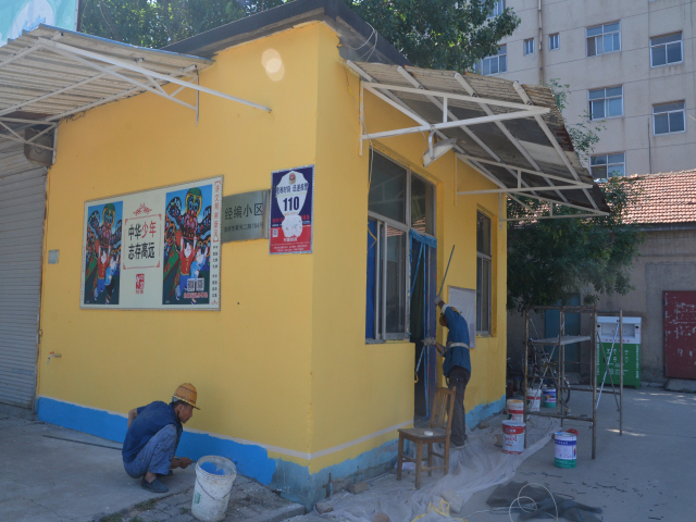 圖為公司志愿者粉刷經編小區(qū)警衛(wèi)室、清理周邊環(huán)境衛(wèi)生等情形。