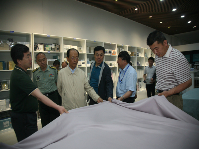 市人大常委會副主任呂德章,市政協(xié)副主席吳國瑞、趙建明,濱州軍分區(qū)參謀長許增全,公司黨委書記、董事長王力民,副總經(jīng)理孫中然等,陪同張文臺上將一行參觀了家紡展廳等處所。